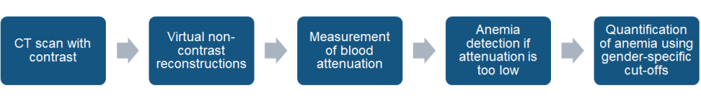 In brief, virtual non-contrast series need to be reconstructed using photon-counting CT datasets. On these series, the attenuation of blood needs to be measured. If this measurement is low, it may indicate anemia. Using gender-specific cut-offs, this value can then be used to quantify anemia.